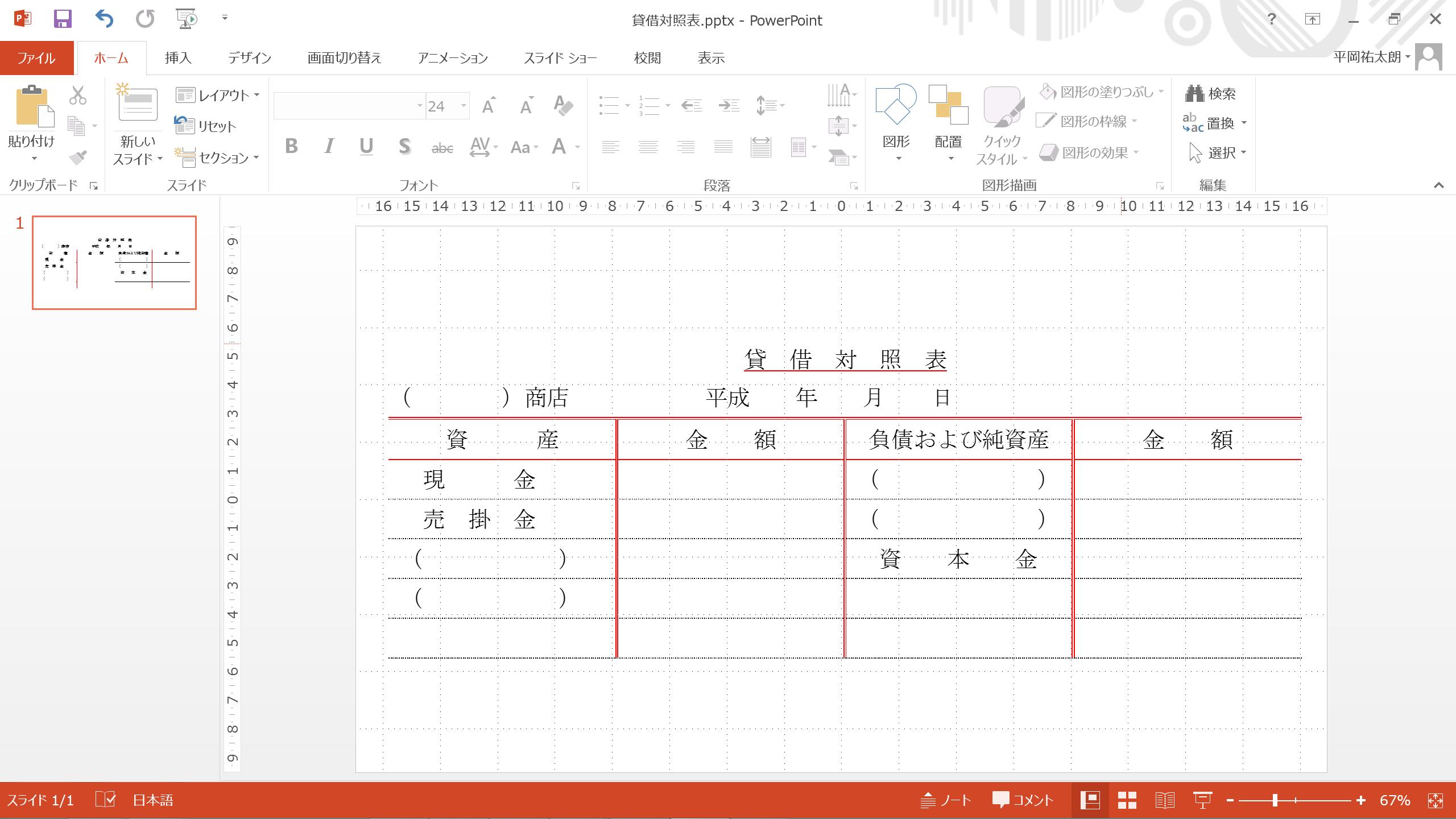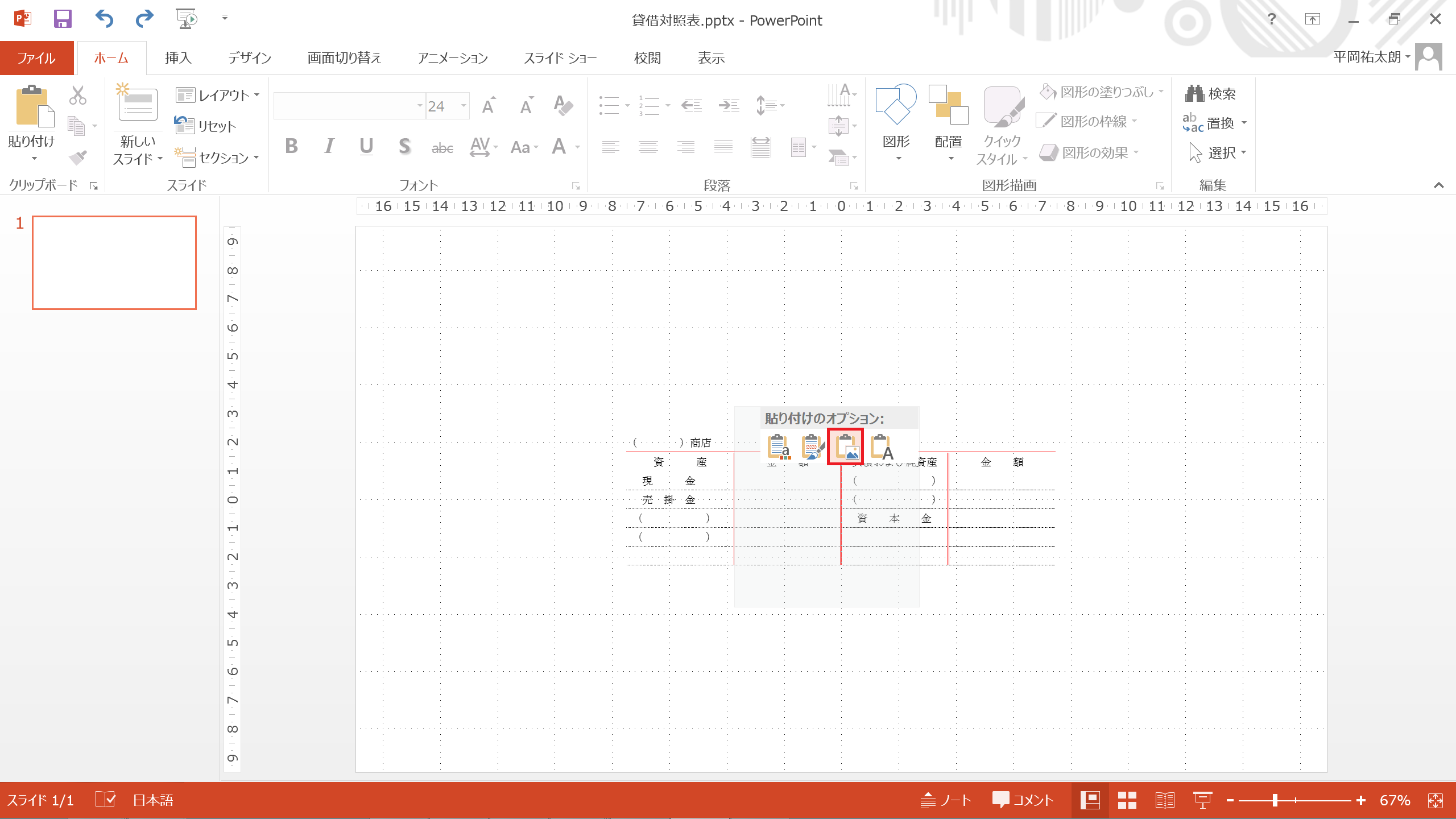 これで、wordで作成した貸借対照表がPowerPointに貼り付けられました。