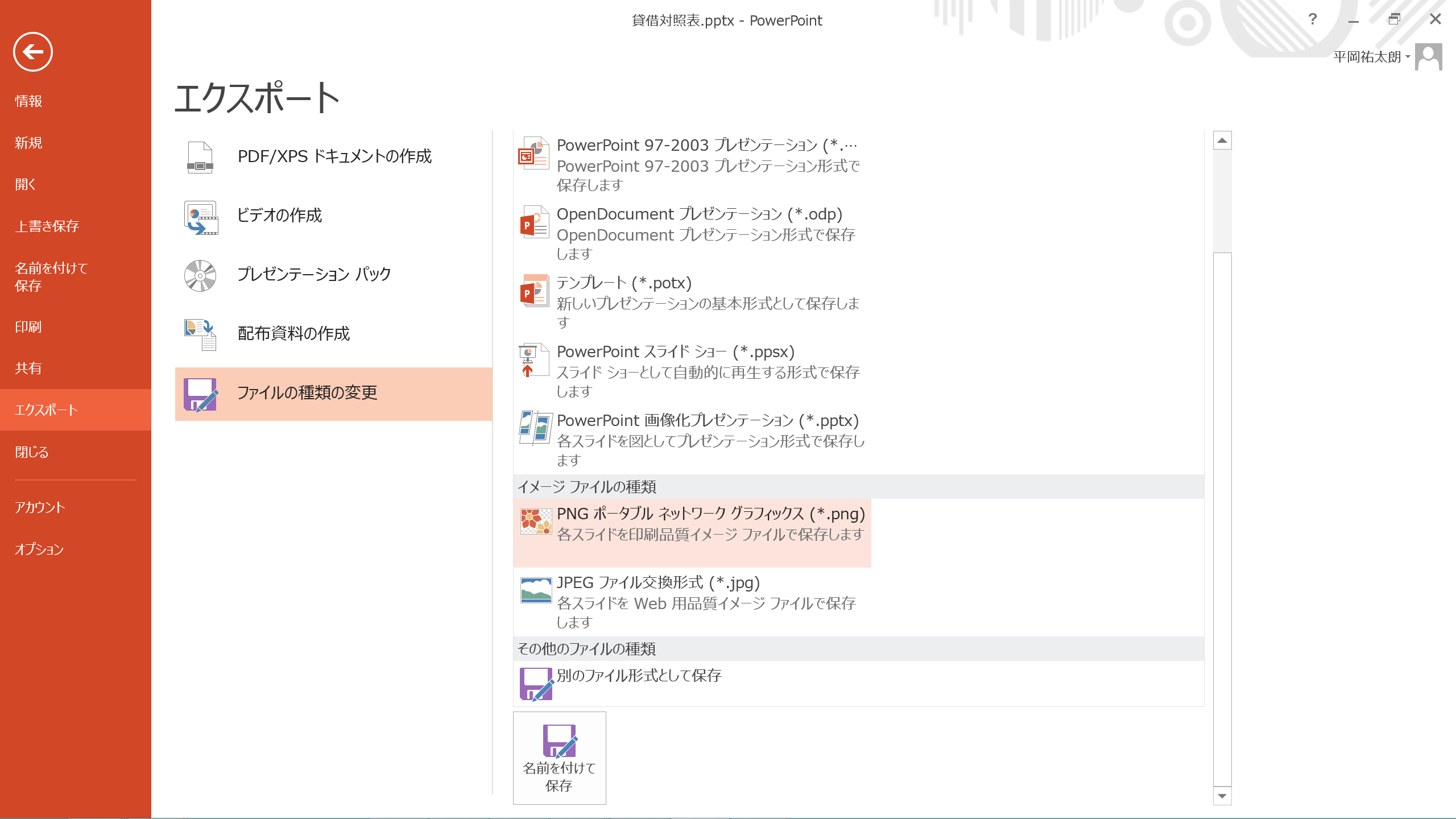 ファイル→エクスポート→ファイルの種類の変更→PNGポータブルネットワークグラフィックス(*.png)→名前をつけて保存→保存先の指定