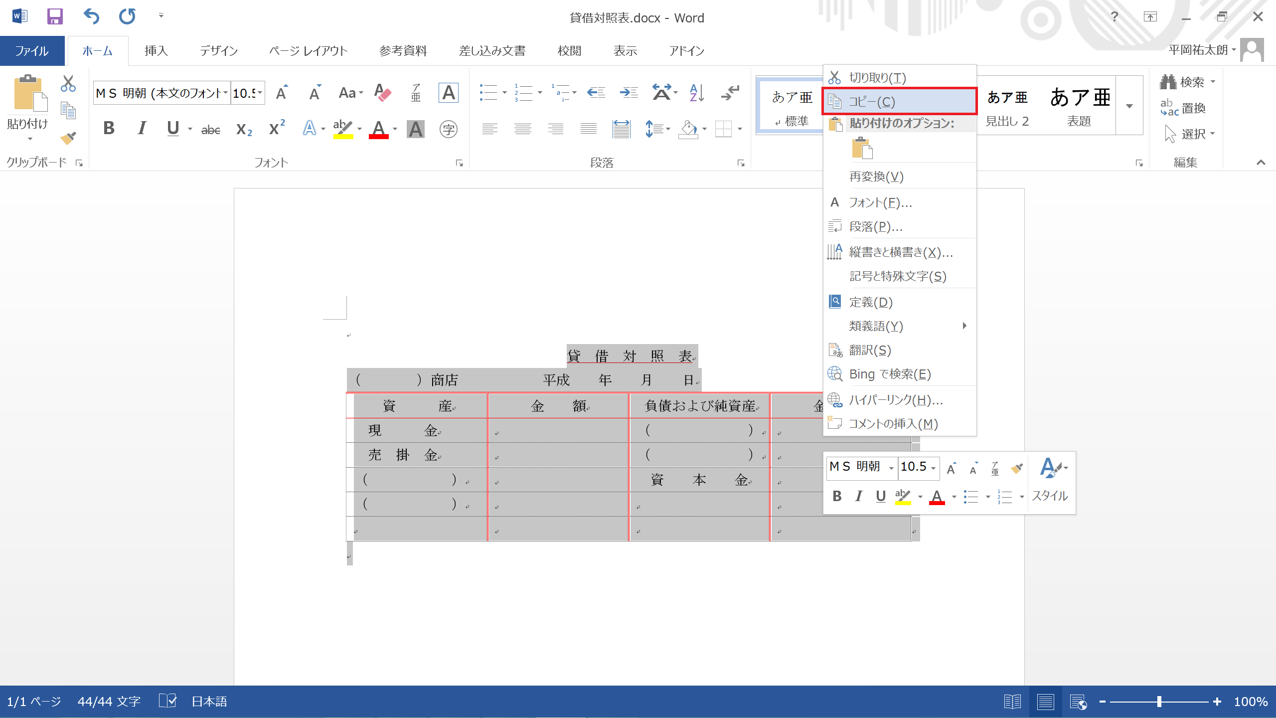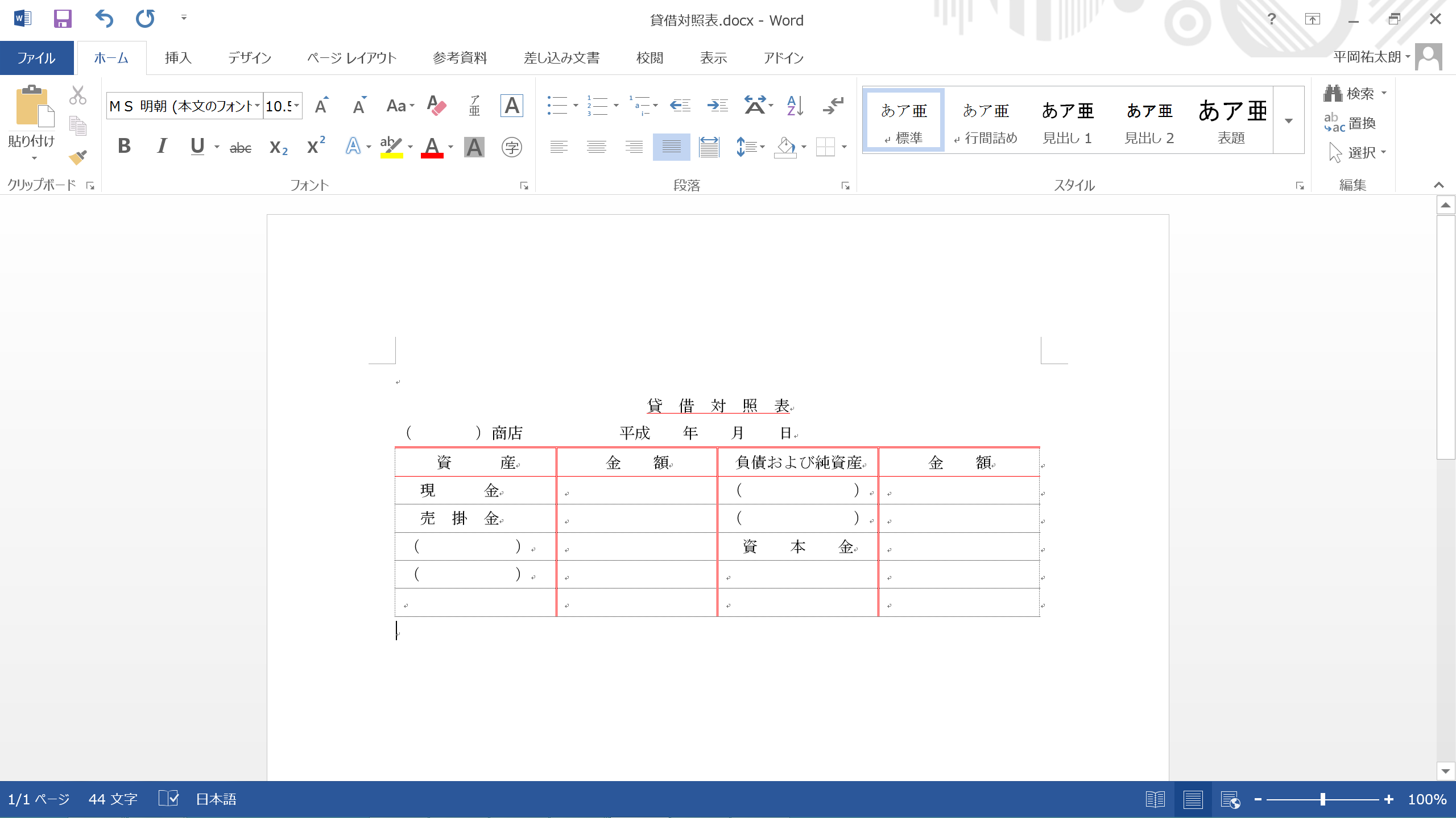まずは、Wordで貸借対照表の作成をします。(※Wordで表をつくる方法は、こちらをご参照ください。)