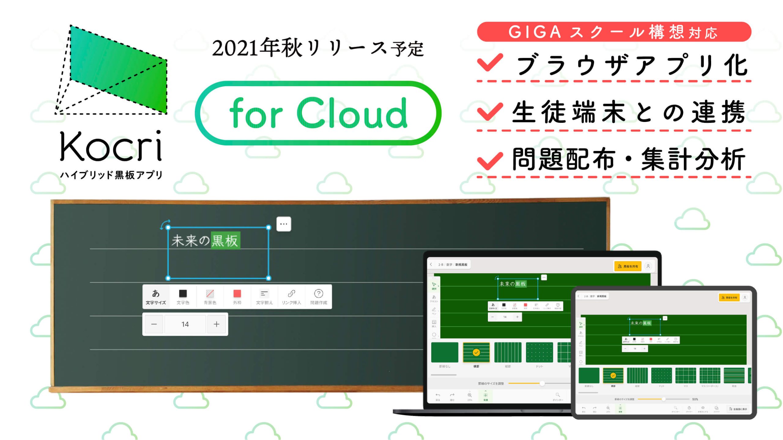 「Kocri for Cloud」はブラウザで動くアプリです。ネット環境とブラウザ(Google Chrome推奨)さえあれば、どこでも最新の状態で、かつiPadやChromebookなど端末を問わずに使用できます。デザインも今までのKocriから大幅にアップデートし、初めての方でもシンプルで分かりやすいデザインとインターフェイスを追求しています。