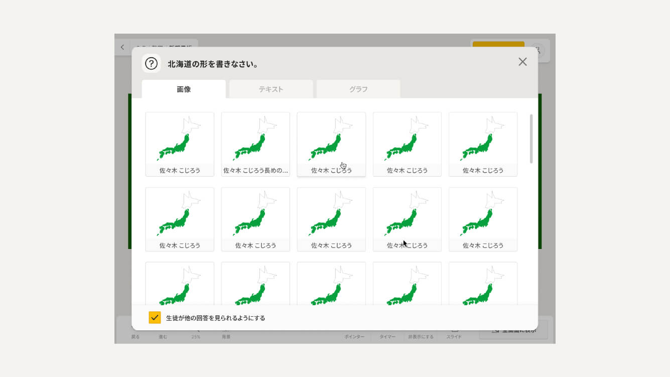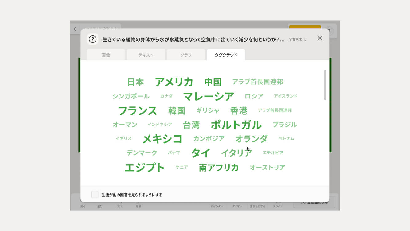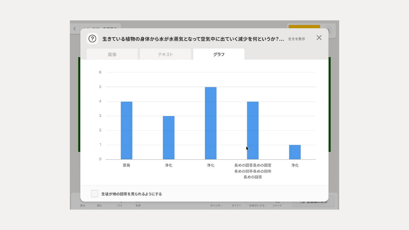 スライドに配置した画像やテキストに対して「問題」を挿入でき、「問題」は各生徒側の端末から回答できます。回答結果は自動で集計されて、一覧表示やグラフ表示することが可能です。