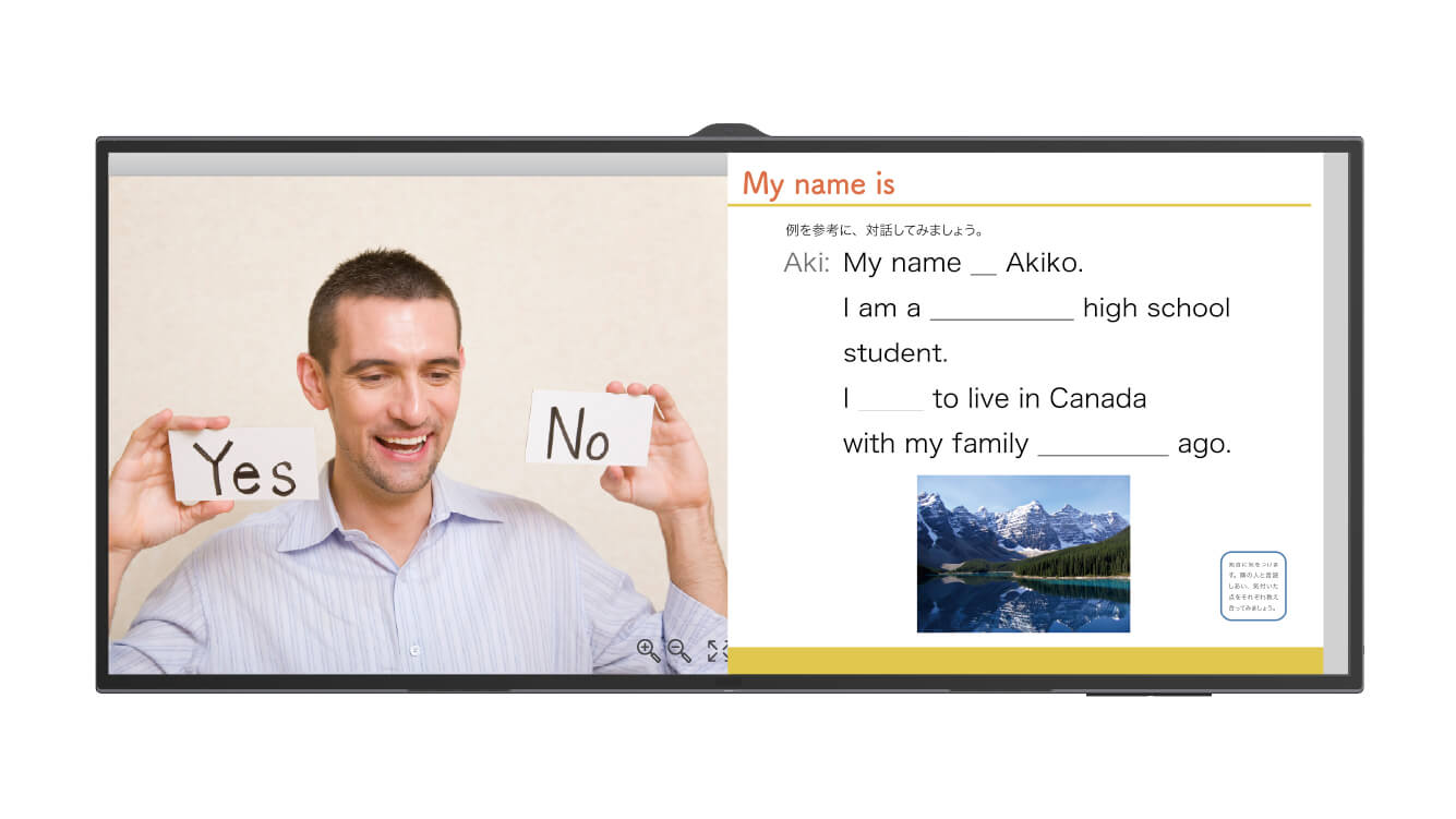 映し出されるのは、鮮やかな色のデジタル教科書や画像。アフターGIGAスクールとも相性が良く、大きい画面で一つの資料を見せるだけでなく、分割表示して「並べて見せる」展開が得意です。