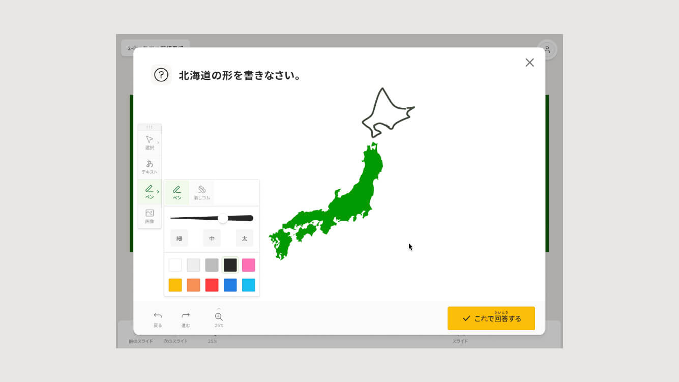 選択問題、自由記述問題、ペンで書き込む問題など、そのままテストに出来るくらいの実践的な問題フォーマットをいくつか用意しました。教師が作成した問題は、ボタン一つで生徒の画面に一斉に配布でき、子どもたちは各々の席で回答することができます。