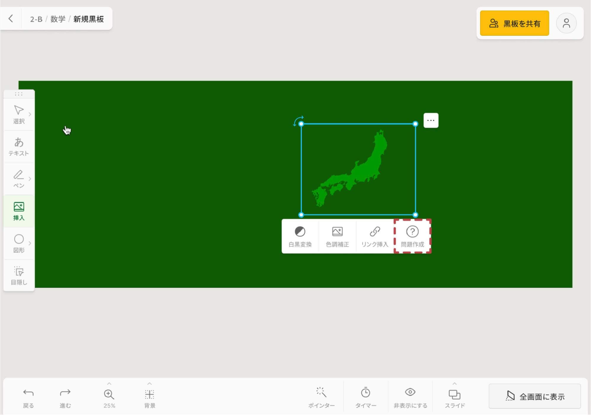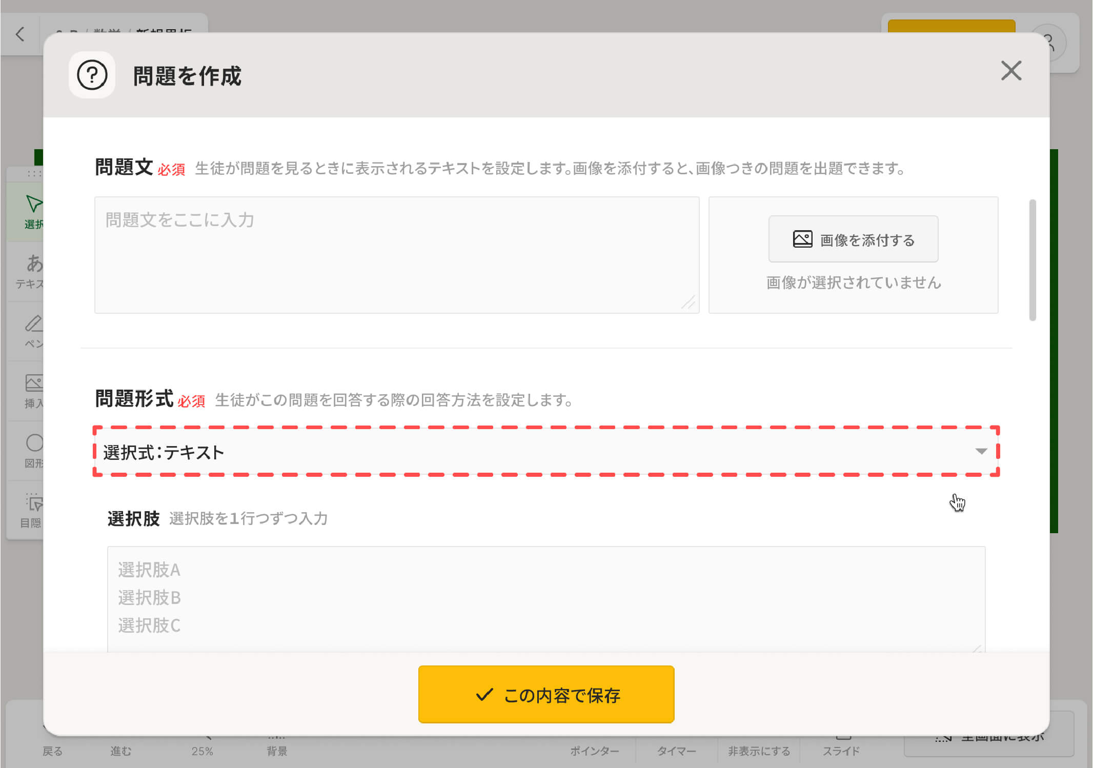 スライドに配置した画像やテキストに対して、「問題」を挿入しましょう。「問題を作成」画面に切り替わり、問題文を打ち込むことができます。