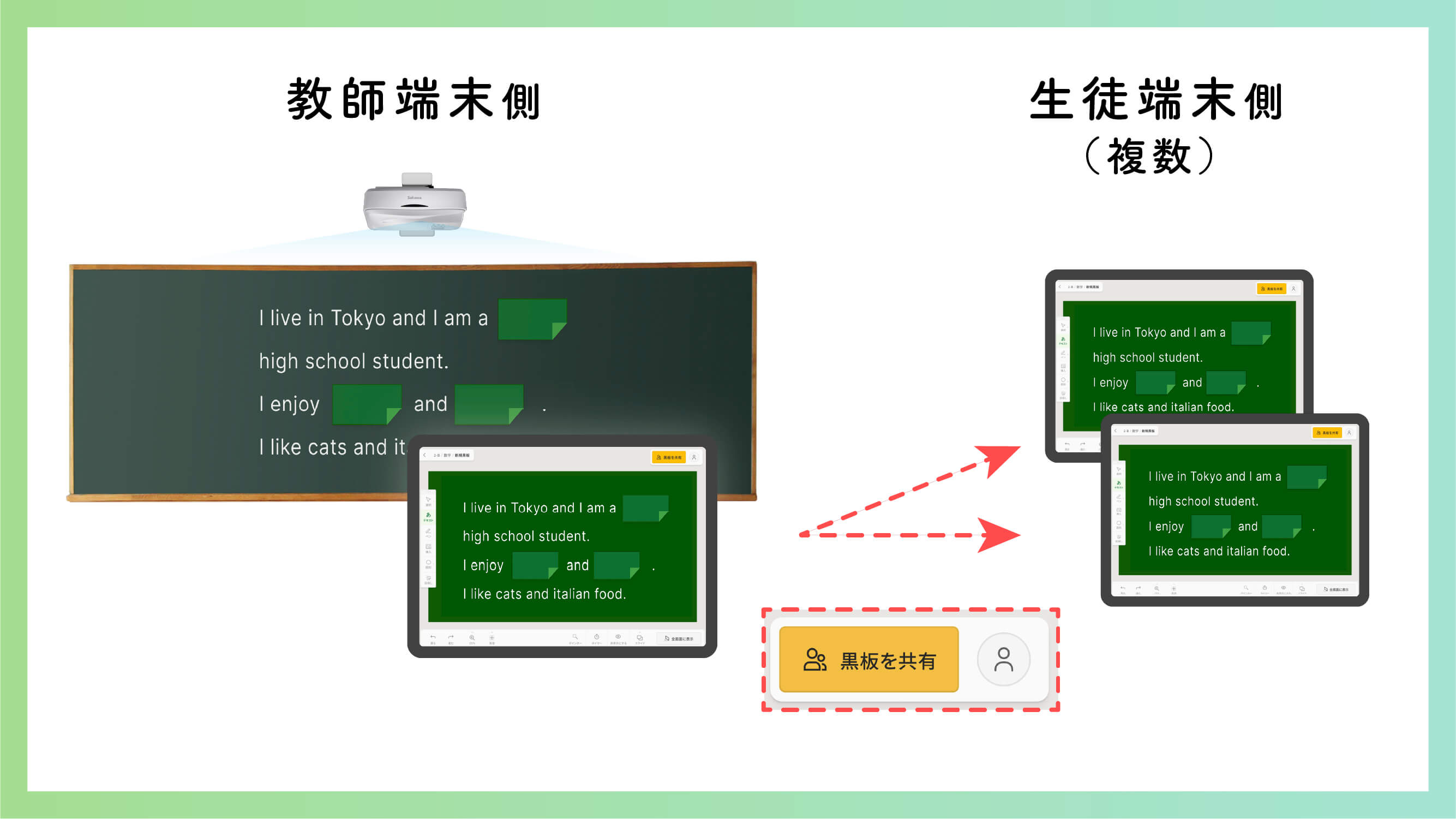 また、GIGAスクールによる児童生徒1人1台端末を最大限活用できる「生徒端末との連携」機能を追加しました。これにより、双方向授業を行うために最適な環境をご提案します。