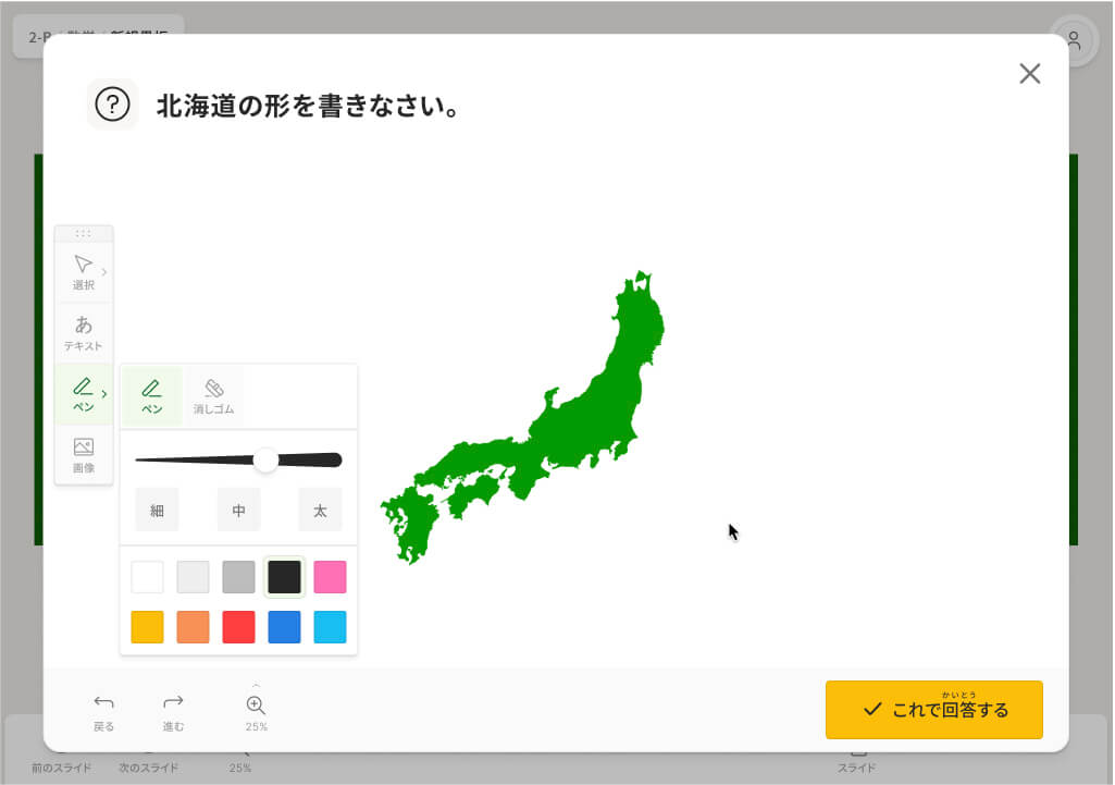 「北海道の形を書きましょう」という問題を生徒端末で表示した様子。児童生徒は「ペン」機能を使って答えを書き込み、回答します。
