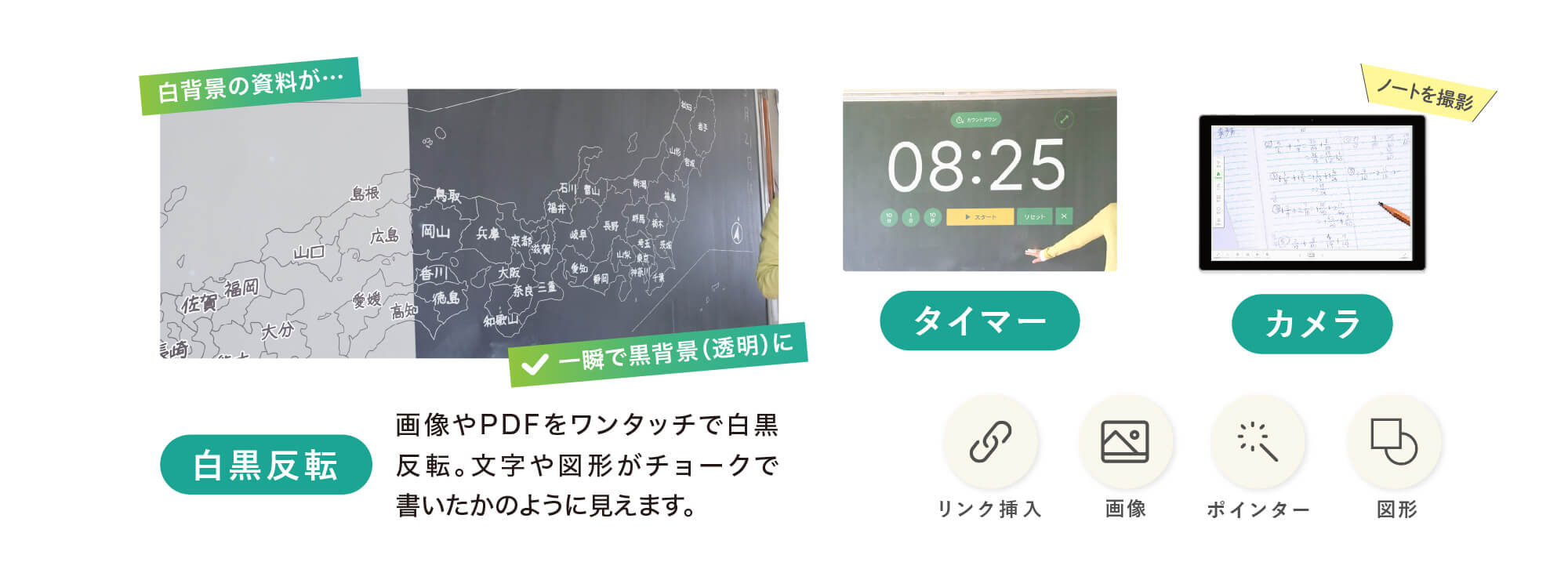 ・動画、画像、図形、テキストなどを黒板に投影し、上からチョークで書き込む