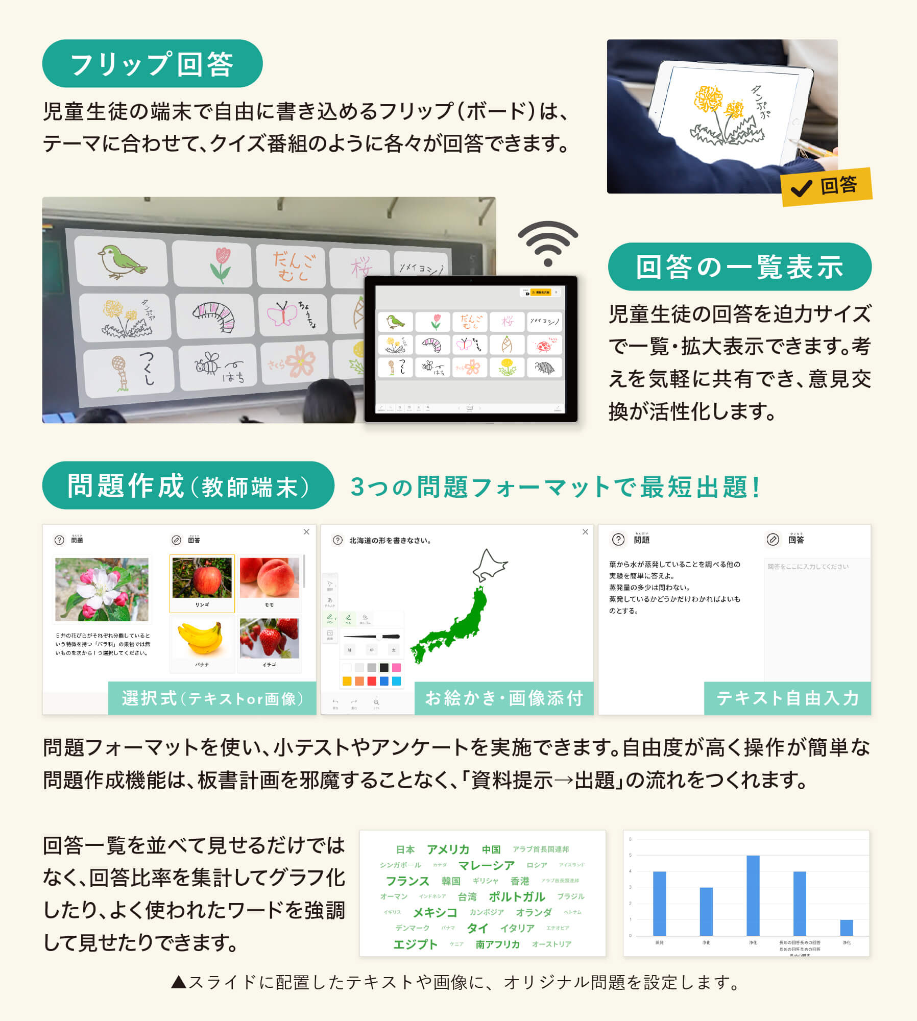 すぐに回答を集計して結果のグラフを生成します。また、生徒の端末で自由に書き込めるフリップ(ボード)は、クイズ番組のように各々がペンで書いて回答できます。ワイードウェブならではの迫力サイズで皆の回答を黒板に表示し、意見交換しやすい教室環境を作りましょう!