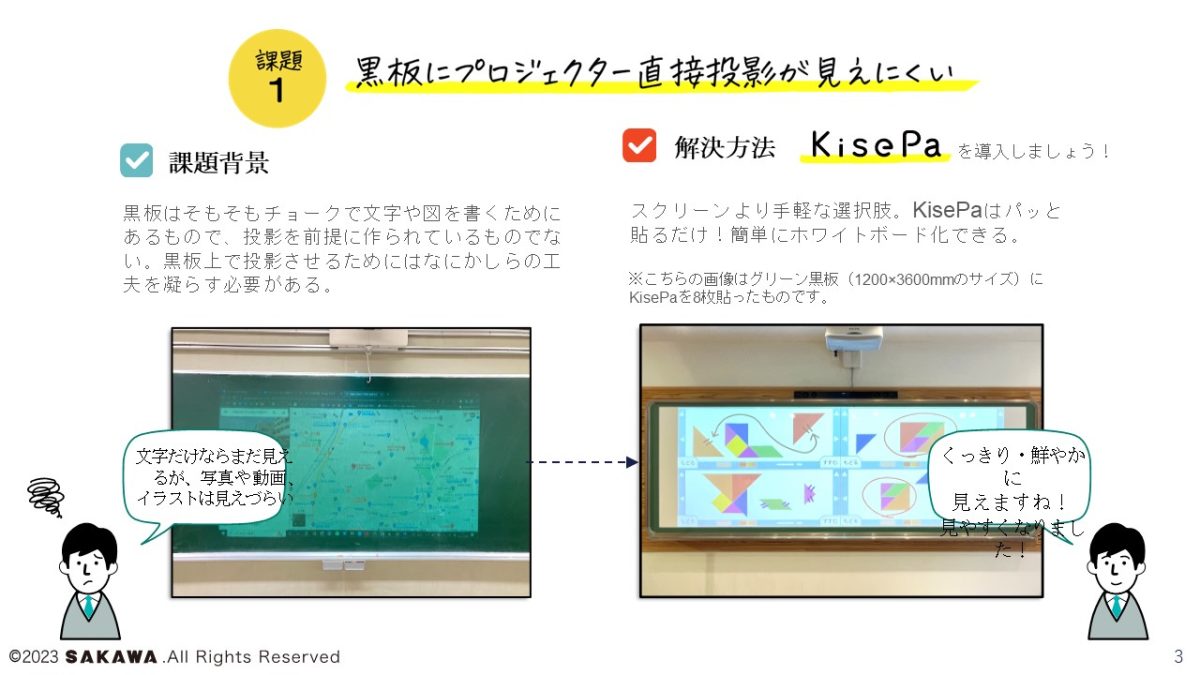 黒板の一部にKisePaを貼れば、プロジェクターのスクリーンに。