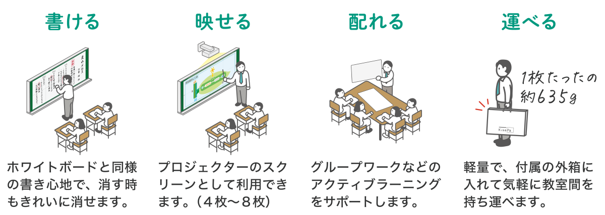 使いたいときに、使いたい位置にKisePaを貼ることで、授業や教科に合わせて、黒板を思いのままにホワイトボードに着せかえることができます。 手軽に試せる4枚セットと、8枚セットをラインナップしました。
