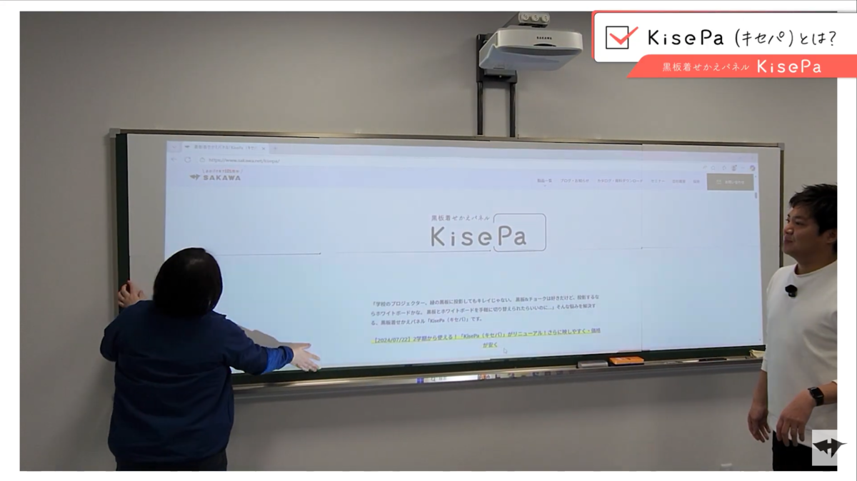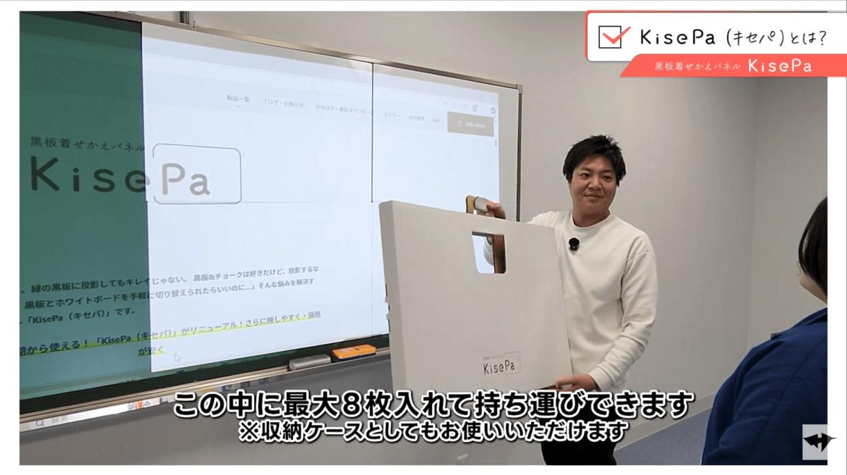 社長: なるほど。黒板も使いたいし、ホワイトボードを使いたい。けれど予算的に厳しい。せっかくプロジェクターを買ったのに、性能を活かしきれないのは勿体ないよね。 そんな悩みを解決する黒板着せかえパネル「KisePa(キセパ)」という製品があるので、紹介したいなと思います!