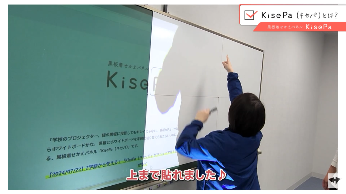 社長:そんな先生の声から開発したのが、黒板着せかえパネル「KisePa(キセパ)」です!では実際に、黒板を着せかえてみます。